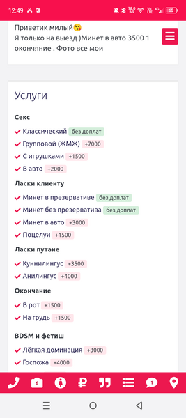 28.02.2026 10:11 №67356Привет,часик у меня стоит 5000 р,выезд есть,в квартире без посторонних, предоплаты нет, квартира в центре, на выезд оплата такси в обе стороны+7 (905) Показать номер