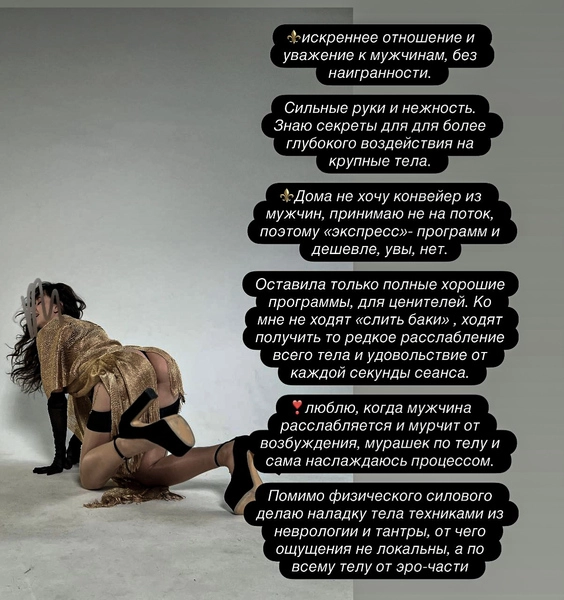 14.02.2026 19:53 №70258Приятная взрослая с пышными формами мадам приглашает на массаж мужчин от 35 лет, адекватных, в трезвом состоянии Классический профессиональный+релакс+лингама БЕЗ ИНТИМА.в обычной одежде 3т В чулочках и халатике "можно трогать" 4т. Центр. Фото при общ+7 (906) Показать номер