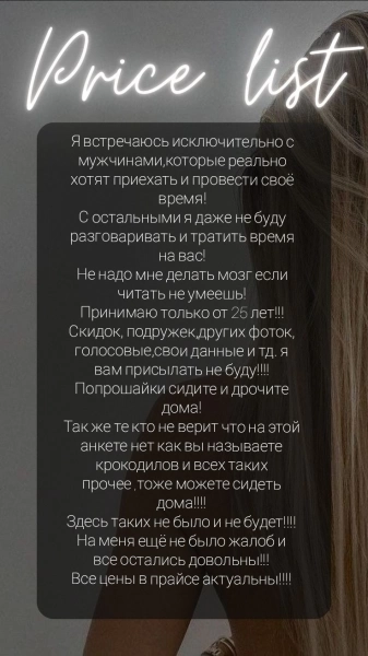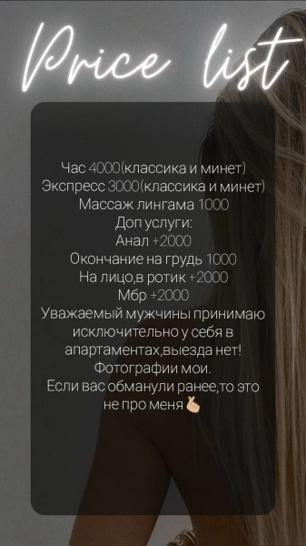 11.02.2026 10:48 №70201Привет я молодая, красивая, стройная девушка реальная инди. Принимаю в солнечном часик 6500. Принимаю одна.+7 (937) Показать номер